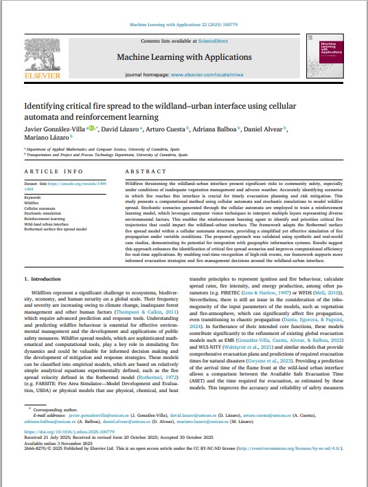 Nos alegra compartir la publicación de nuestro artículo “Identifying critical fire spread to the wildland–urban interface using cellular automata and reinforcement learning” en la revista Machine Learning with Applications.